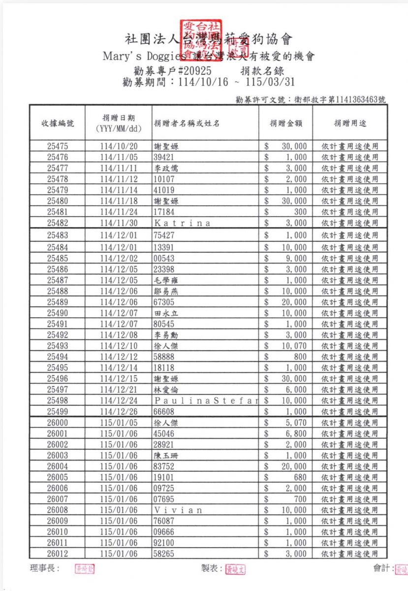 感謝Mary’s Doggies慷慨的支持者。您的捐款幫助我們改寫台灣浪犬的命運。以下是我們珍貴的捐款者名單,感謝他們對Mary’s Doggies 的無私奉獻,為每一隻需要幫助的狗提供愛和關懷。
